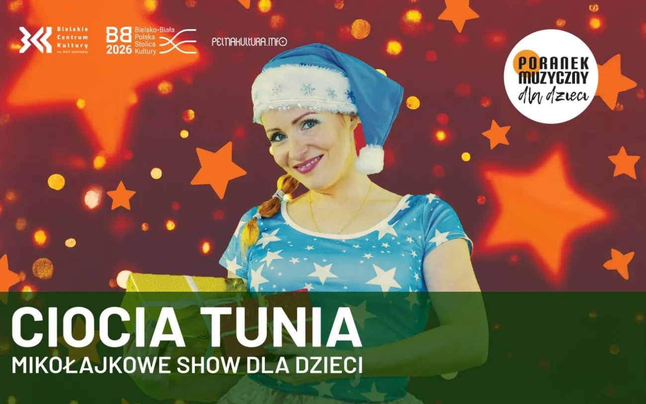 niedziela, 1 grudnia 2024, godz. 11:00„Ciocia Tunia - Mikołajkowe Show dla dzieci" - Interaktywny koncert z muzyką na żywo i doskonała propozycja koncertowa przeznaczona zarówno dla dzieci jak i ich rodziców. Dzięki swojej charyzmatycznej i otwartej postawie na scenie oraz nietuzinkowemu wokalowi, Ciocia TUNIA zabiera dzieci w zimowy, bajkowy, roztańczony i rozśpiewany świat gdzie dobrej i mądrej zabawy nie ma końca. Na scenie Ciocia Tunia wraz zespołem muzycznym oraz nadzwyczajnymi asystentami. W programie autorskie mikołajkowe i świąteczne utwory oraz znane i lubiane zimowe hity dla najmłodszych. Nie zabraknie także wizyty wyjątkowego gościa. Dobra muzyczna zabawa gwarantowana.