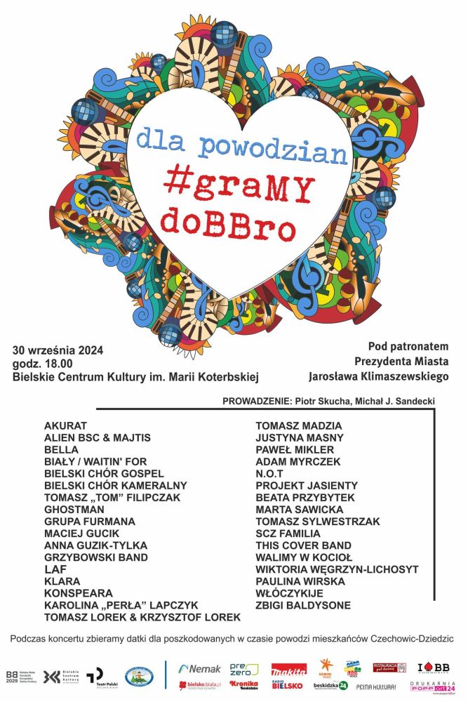 poniedziałek, 30 września 2024, godz. 18:00Bielsko-Biała, pokażmy nasze serca i zagrajmy wspólnie dla powodzian z Czechowic-Dziedzic! Już 30 września o godzinie 18:00 w Bielskim Centrum Kultury im. Marii Koterbskiej odbędzie się wyjątkowy koncert charytatywny – VIII edycja Gramy doBBro. W tym roku wszystkie zebrane fundusze zostaną przekazane na pomoc mieszkańcom Czechowic-Dziedzic, którzy ucierpieli w wyniku katastrofalnej powodzi.