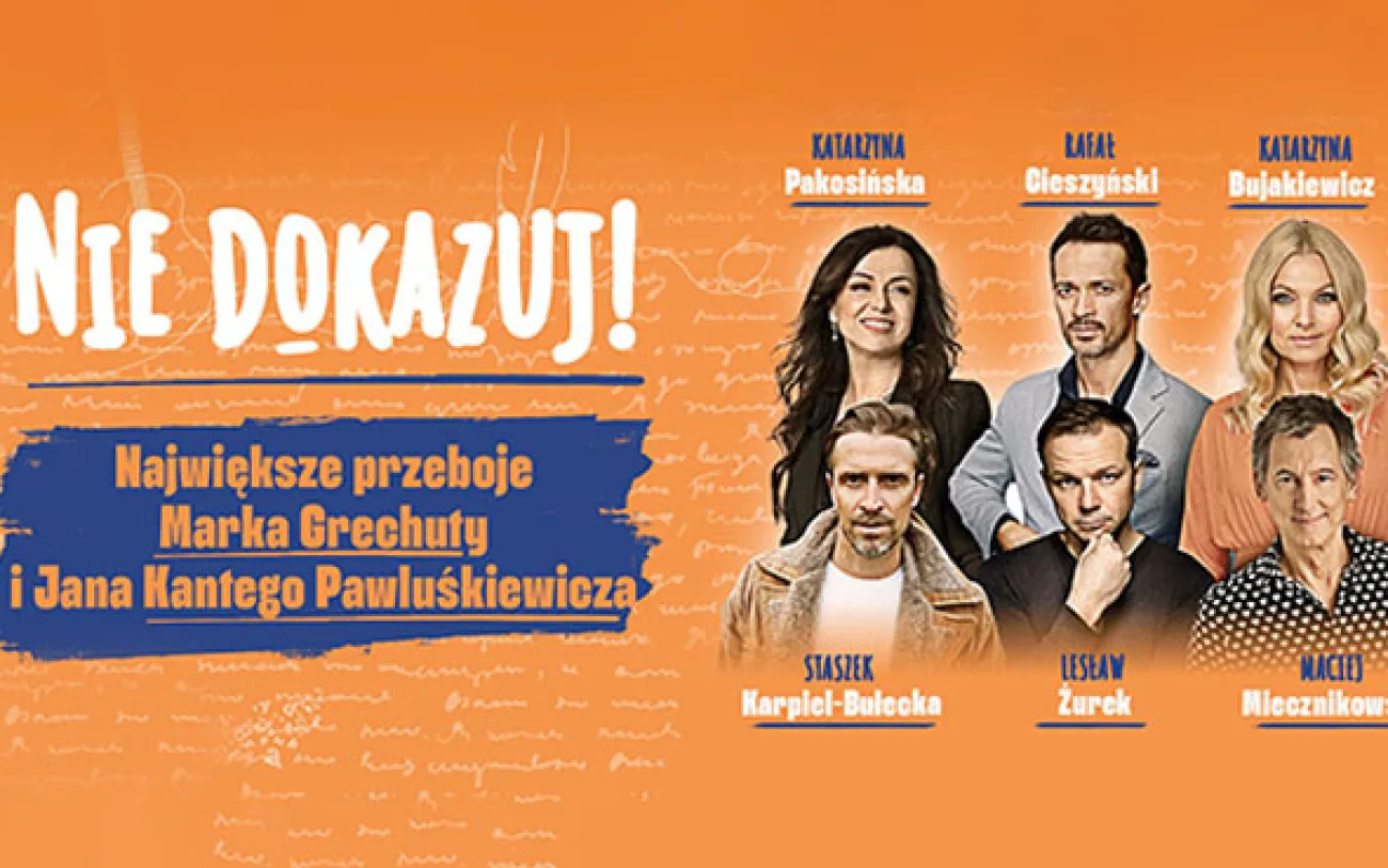 „Nie dokazuj! Największe przeboje Marka Grechuty i Jana Kantego Pawluśkiewicza”. to wydarzenie, które łączy muzykę, humor i niezwykłą charyzmę artystów, oferując publiczności niezapomniane emocje. To koncert, który bawi, wzrusza i angażuje – nie przegap tej wyjątkowej okazji, by poczuć magię Grechuty na żywo!